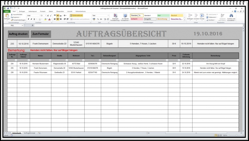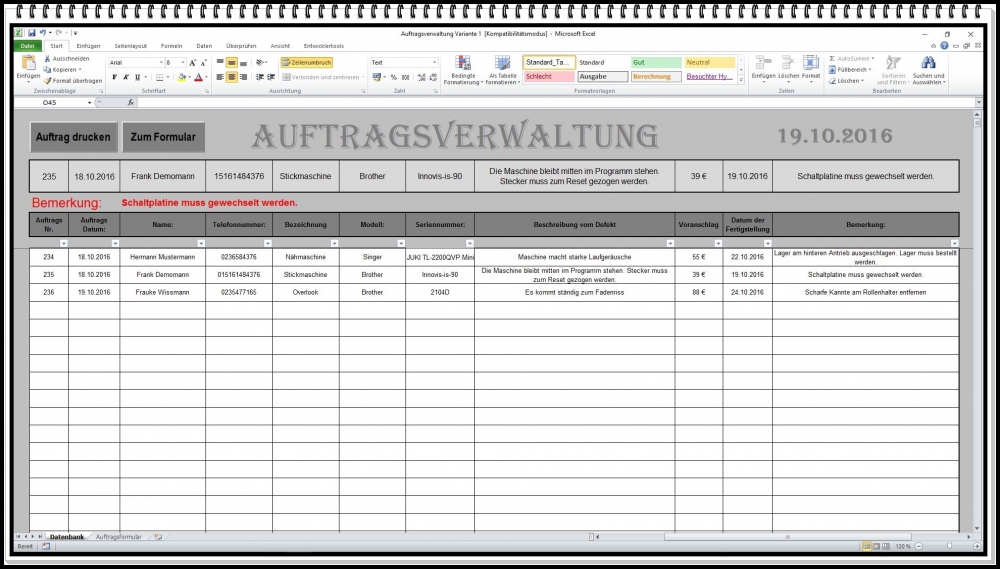 Auftragsverwaltung mit Abholschein auf Excel-Basis