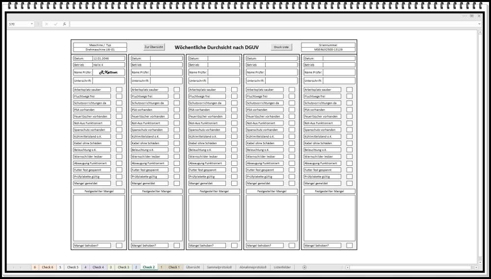 Mit dem Excel Prüfbuch für Zerspanungsmaschinen nach DGUV erhalten Sie eine leistungsstarke, praxisorientierte und sofort einsatzbereite DGUV Prüfsoftware, mit der Sie Ihre Maschinenprüfung DGUV-konform effizient organisieren und dokumentieren können – ganz ohne teure Spezialsoftware oder komplizierte Installation.