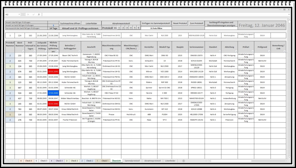 - bald fällige Prüfungen und überfällige Maschinenprüfungen, farblich hervorgehoben an.