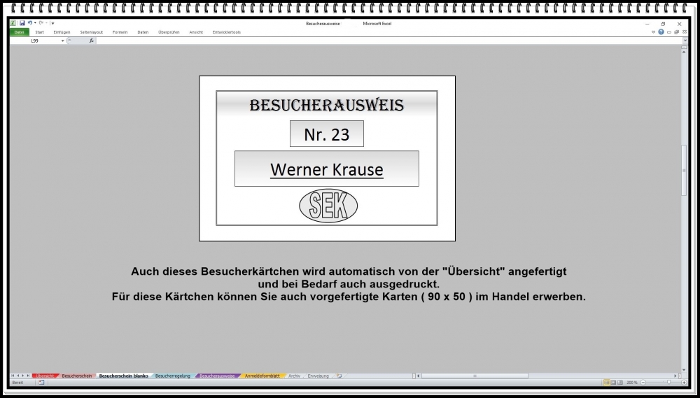 Unsere Excel Software zur Besucherverwaltung bietet alle Funktionen, die Sie für ein modernes Besuchermanagement benötigen: digitale Anmeldung, Ausgabe von Besucherscheinen, Firmenrichtlinien, Hausordnung, UVV-Hinweise und Sicherheitsinformationen.