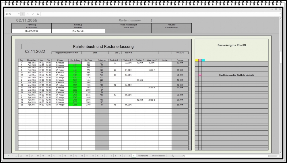 Fahrtenbuch Excel mit Verbrauchs- und Kostenanalyse