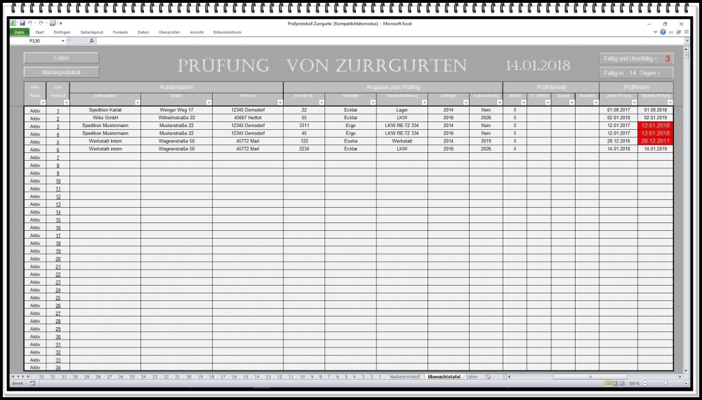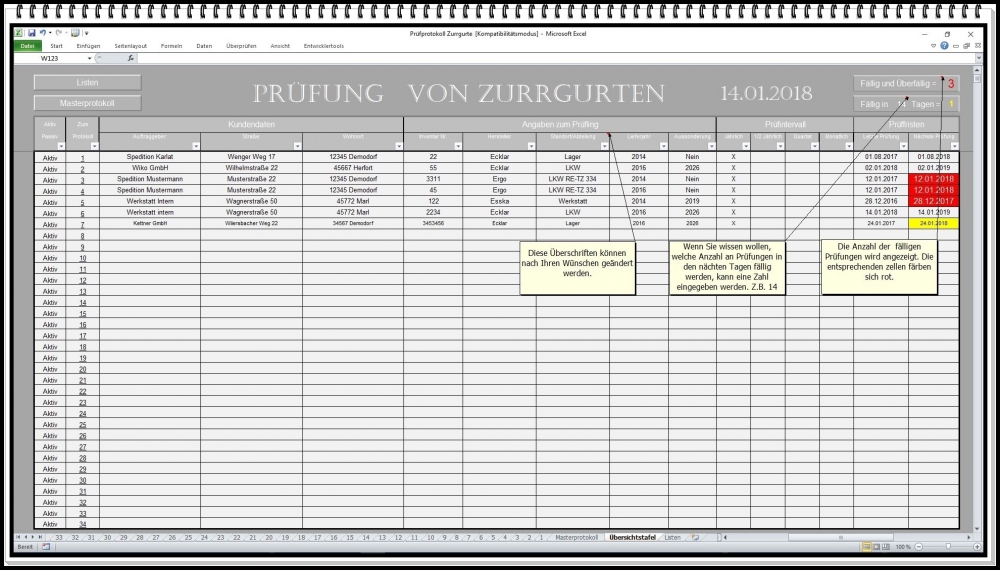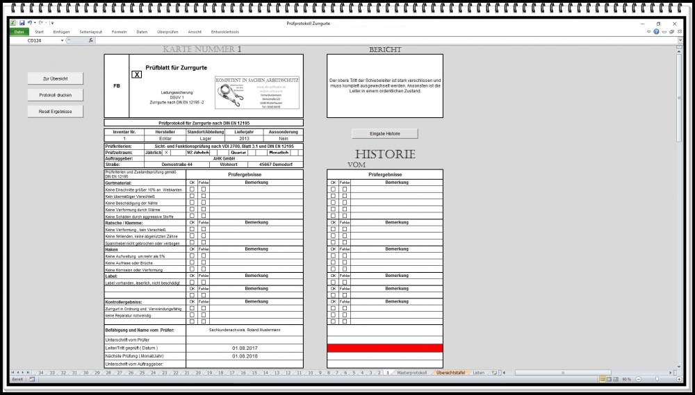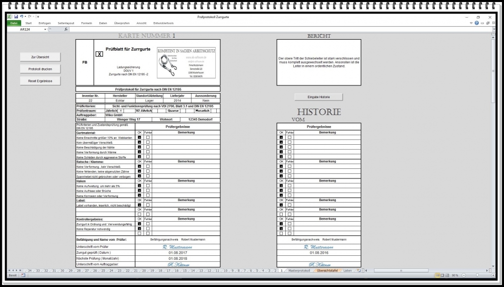 Pro Datei können bis zu 100 Anschlagmittel verwaltet werden, wobei jeder Prüfling ein eigenes Prüfprotokoll mit Historie und druckbarer Dokumentation erhält. Eine zentrale Übersichtstafel zeigt alle Arbeitsmittel, den nächsten Prüftermin sowie fällige Prüfungen an.