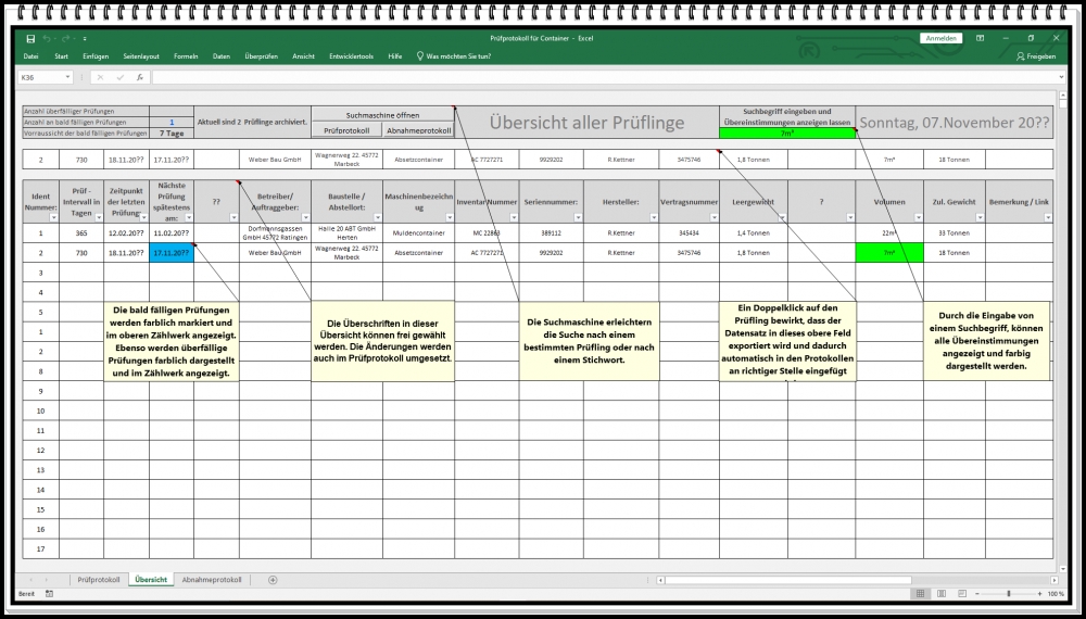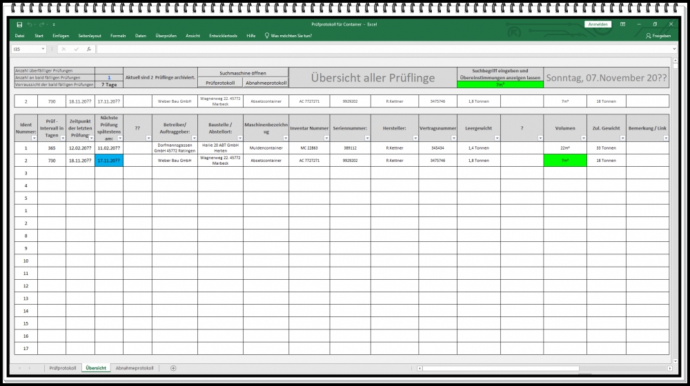 Alle Container und Prüflinge werden übersichtlich in einer zentralen Übersichtstafel verwaltet. Das System speichert Prüfintervalle, letztes Prüfdatum und den nächsten Prüftermin und erinnert automatisch an fällige oder bald fällige Prüfungen.