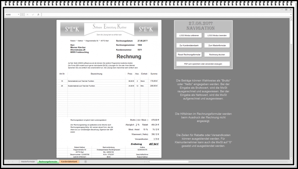 Eine integrierte Kundendatenbank speichert alle wichtigen Kundendaten. Diese können per Doppelklick automatisch in das Rechnungsformular übernommen werden. Das Rechnungslayout lässt sich individuell anpassen und kann mit Firmenlogo personalisiert werden.