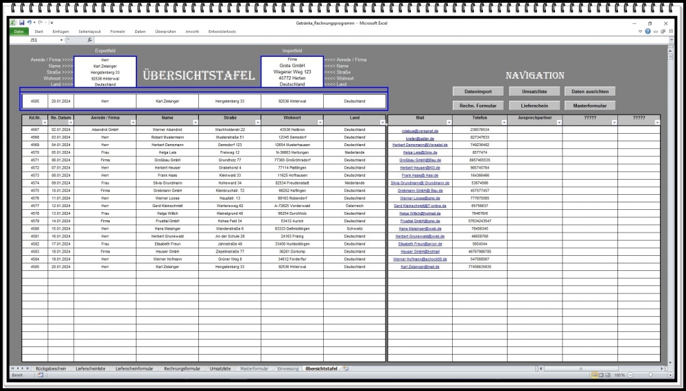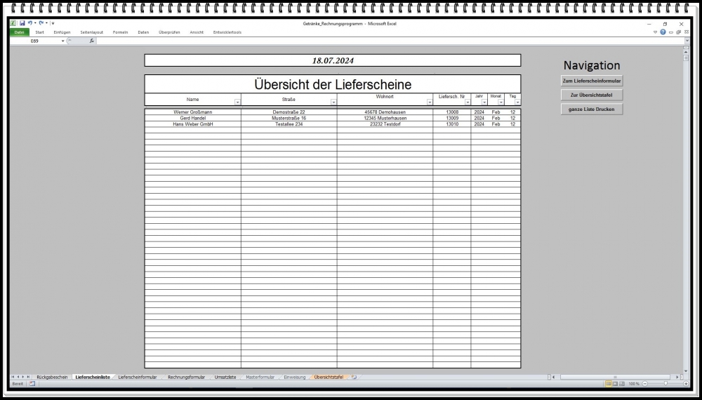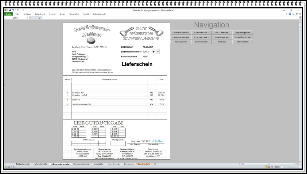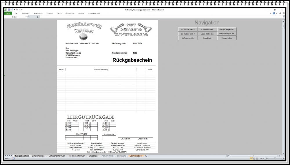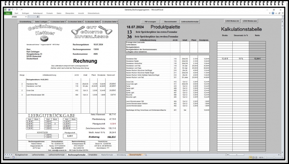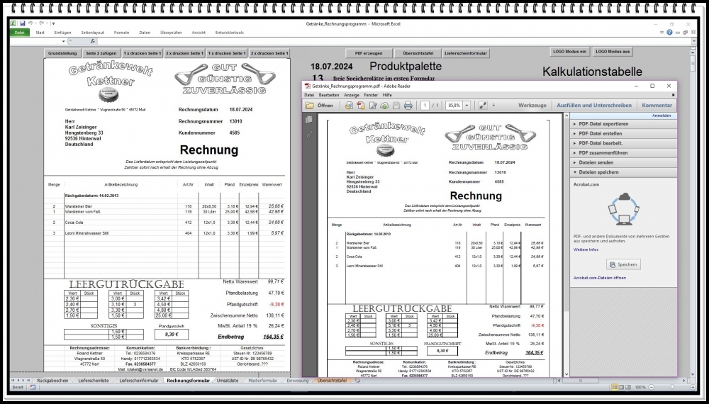 Rechnungsprogramm Getränkehandel – Excel Software für Rechnung, Pfandabrechnung und Lieferschein (1 Stück)