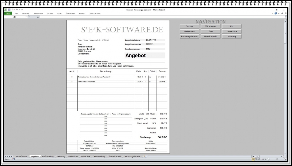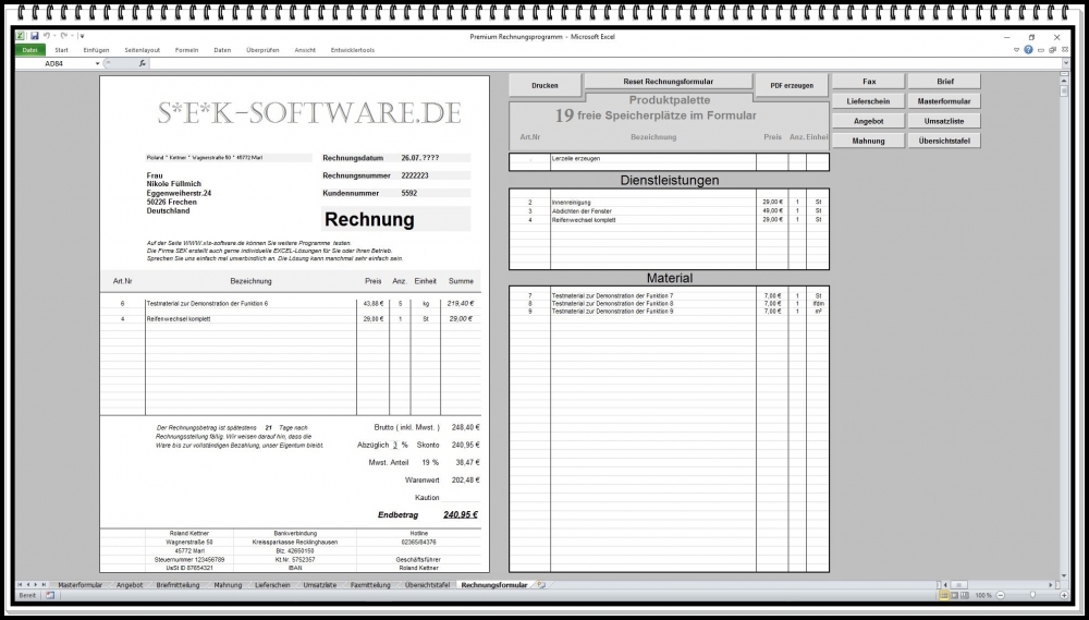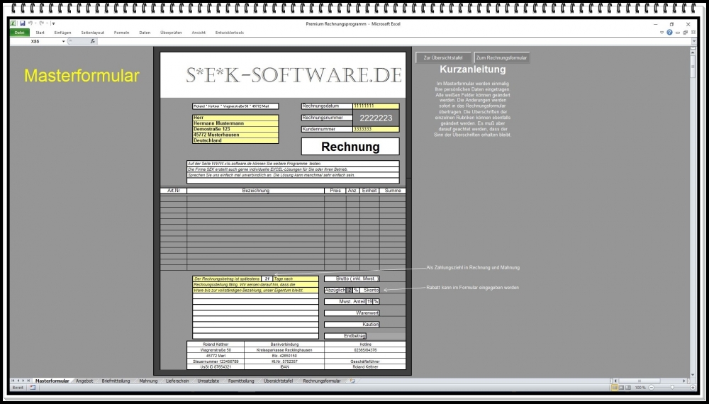 Dieses Rechnungsprogramm ermöglicht das schnelle und professionelle Erstellen von Rechnungen, Angeboten, Lieferscheinen und Mahnungen – auch ohne umfangreiche Computerkenntnisse. Ideal für Kleinunternehmer nach §19 UStG sowie Unternehmen mit Mehrwertsteuer Berechnung.
